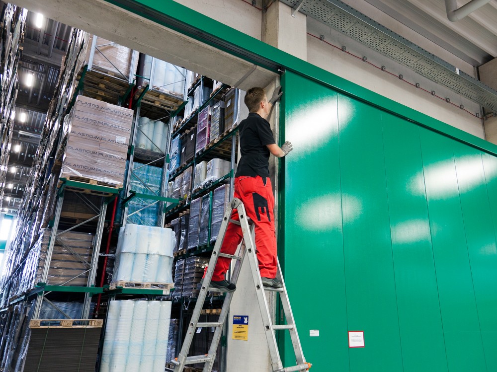 Die Türen und Tore werden von einem Magneten an der Wand festgehalten und sind somit geöffnet. Im Brandfall lösen sich die Türen automatisch von dem Magneten ab und fallen zu. Dadurch wird die Ausbreitung von Feuer und Rauch dezimiert.